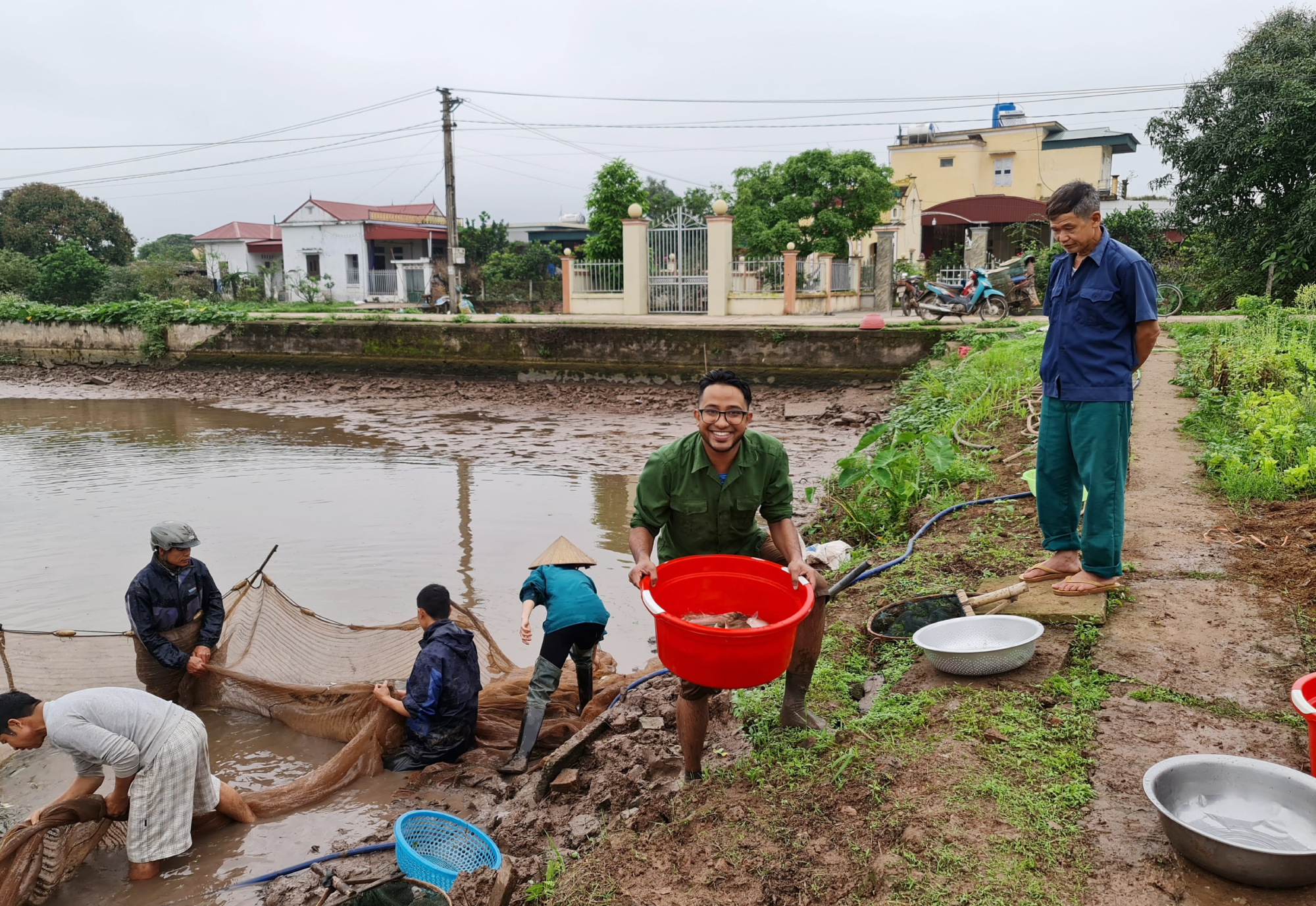 | Shanewas Shakhawat drains the pond and catches fish at his wife's house in Thai Binh, 2025. Photo supplied by Shakhawat |