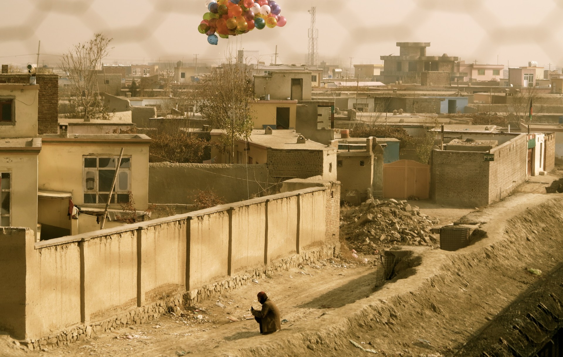 One photograph Charlie took showed a man holding a collection of helium balloons that floated above the terrain: 'It gave a small sense of hope, which we now realize was too optimistic. 'It was shot from behind barbed wire, yet it was an ordinary scene in a war setting. It's this contrast.'