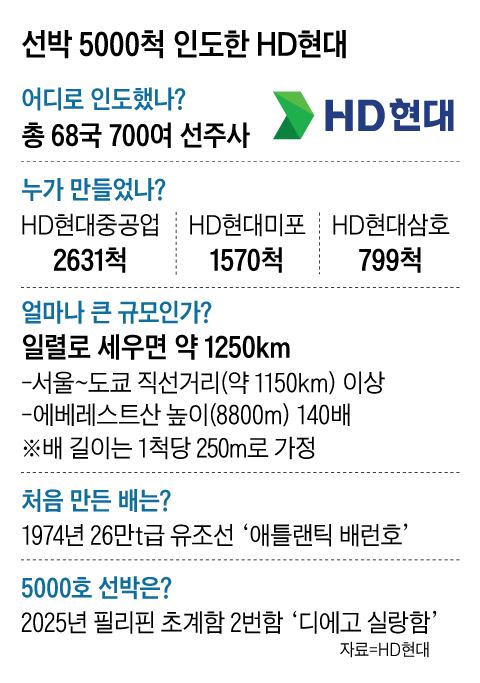 HD Hyundai celebrated the delivery of its 5,000th ship at its HD Hyundai Heavy Industries facility in Ulsan on the 19th, stating, “We have reached a historic achievement by delivering a total of 5,000 vessels, a first for any single company in the history of global shipbuilding.” This accomplishment outperforms Europe and Japan, which have long-standing traditions in shipbuilding, and represents a significant milestone that Chinese state-owned shipyards, which have rapidly expanded their production since the 2000s, have not yet achieved. Since the delivery of its first vessel, the *Atlantic Baron*, HD Hyundai has provided ships to more than 700 shipowners across 68 countries over the past 50 years. HD Hyundai Heavy Industries has delivered 2,631 vessels, HD Hyundai Mipo 1,570, and HD Hyundai Samho 799.