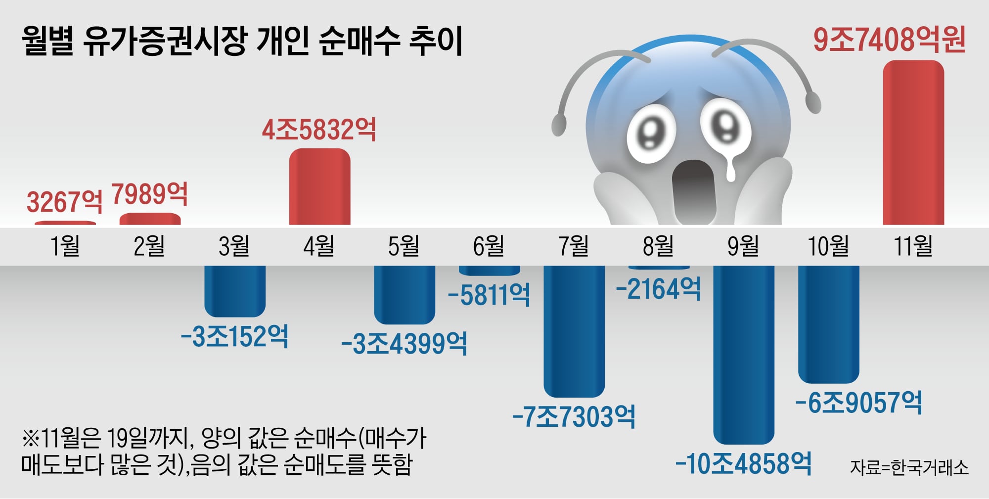 Individual investors have consistently engaged in net selling every month from June to October this year, during the period when the KOSPI started its significant upward movement. Even in September and October, as the index climbed from 3,100 to 4,000, they sold a total of 10.4858 trillion Korean won and 6.9057 trillion Korean won worth of stocks, respectively. However, this month saw a change in direction. With the KOSPI surpassing 4,200 on the 3rd, sparking expectations of reaching "KOSPI 5,000," individual investors net purchased 9.7408 trillion Korean won worth of stocks by the 19th.