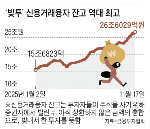 As stock prices varied, the pressure on individuals who took loans to purchase stocks at the peak has increased. Credit financing, which was 15 trillion South Korean won at the beginning of the year, rose to 26 trillion South Korean won this month. Experts say this is due to new participants entering the "debt investing" trend during the "KOSPI 5,000" excitement.