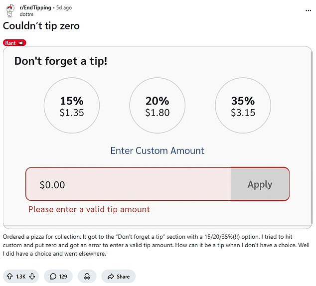 Last week, Daily Mail covered the story of a pizza delivery customercollecting their order reached the payment screen and saw a message that said 'don't forget a tip!' featuring pre-set choices of 15, 20, or 35 percent. There was no 'zero' selection, just a 'custom' field.
